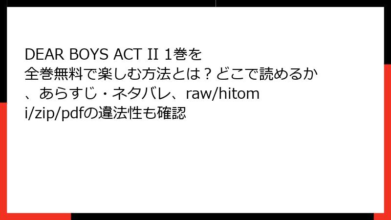 『DEAR BOYS ACT II』1巻を海賊版サイトで読むことは、法律、セキュリティ、倫理、品質の面で多くのリスクを伴います。無料の誘惑は魅力的かもしれませんが、失うものの大きさを考えると、正規の購入が断然おすすめ。好きな作品を長く楽しむためにも、八神先生や漫画業界を応援する選択をしましょう!