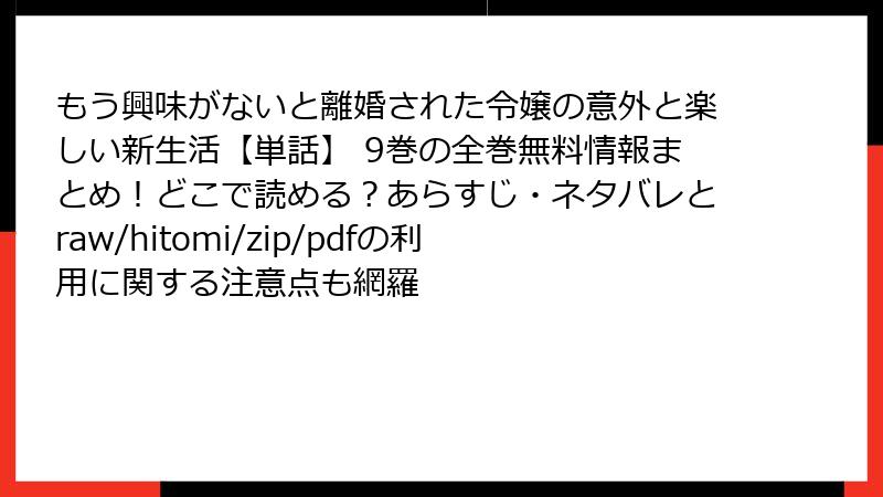 こんにちは、漫画ファンの皆さん! 今回は、和泉杏花さん原作、さびのぶちさん作画の『もう興味がないと離婚された令嬢の意外と楽しい新生活【単話】』の9巻に焦点を当て、ネタバレ全開でその魅力的な展開を詳しく掘り下げます。この巻は、主人公ヴェラの成長、アランとの心温まる関係、そして王宮の陰謀が絡み合う、シリーズ屈指のエキサイティングなエピソード。単話形式でサクサク読める本作ですが、9巻は特に見逃せない展開が満載です。以下、ネタバレを含むので、未読の方はご注意を! 読み終えた方は一緒に盛り上がりましょう!