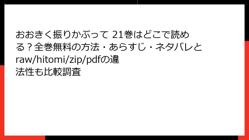 こんにちは、漫画愛好家の皆さん! ひぐちアサ先生の傑作『おおきく振りかぶって』を、rawやhitomi、zip、pdf、漫画バンクなどの海賊版サイトで読もうかと迷っている方へ。無料で手軽に楽しめそうに見えますが、実際には深刻なリスクが潜んでいます。この記事では、そんな海賊版サイトの利用がもたらす法的・セキュリティ・倫理的な危険を、徹底的に掘り下げます。まだ正規ルートを知らない方も、参考にどうぞ。結論から言うと、絶対に避けましょう! それでは、詳しく見ていきましょう。