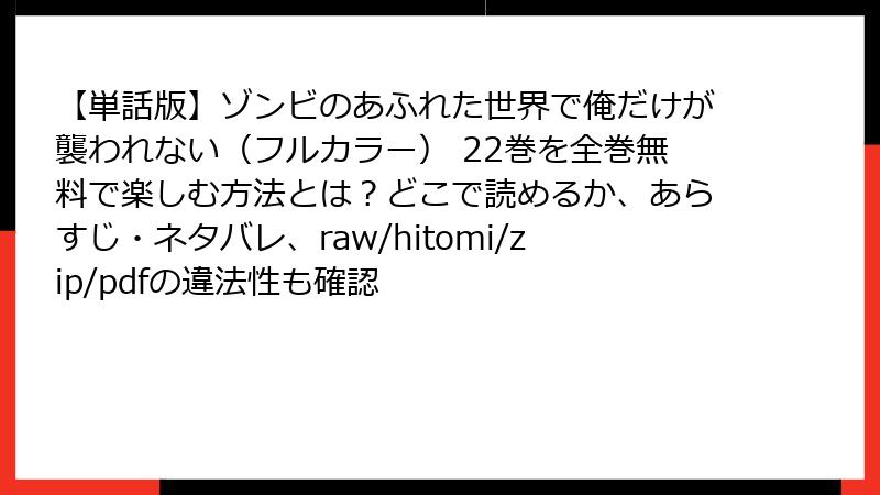 こんにちは、漫画ファンの皆さん! 『ゾンビのあふれた世界で俺だけが襲われない(フルカラー)』は、裏地ろくろ原作、増田ちひろ作画によるゾンビサバイバル漫画で、フルカラーの迫力と緻密な人間ドラマが魅力の人気作です。しかし、無料で読める誘惑に駆られて、raw、hitomi、zip、pdf、漫画バンクなどの海賊版サイトを利用しようと考えている方もいるかもしれません。今回は、これらの海賊版サイトを利用することのリスクを、法的・倫理的・技術的な観点から詳しく解説します。ブログ記事形式で、読み応えのある内容をお届けするので、ぜひ最後までチェックしてください!