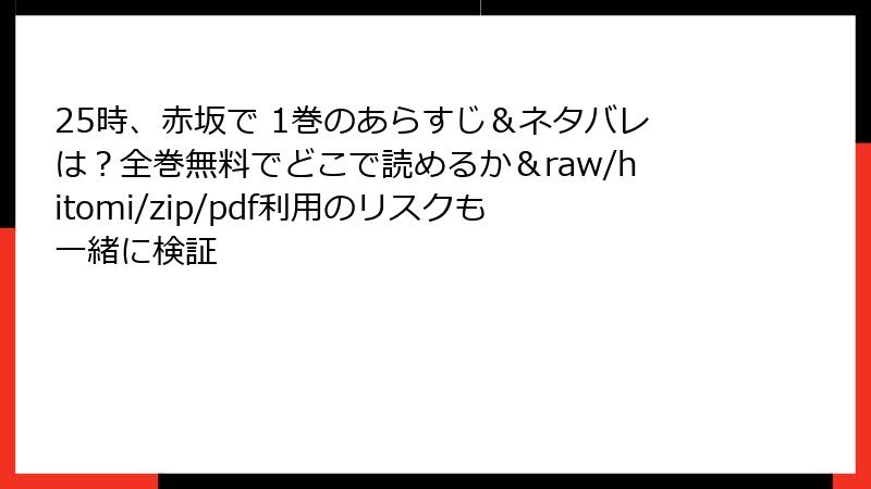 以上、『25時、赤坂で』を海賊版サイトで読むリスクを詳しく解説しました。法的罰則、ウイルス感染、金銭被害、社会的影響…どれも一歩間違えれば取り返しのつかない事態に。無料の誘惑に負けず、正規サービスを選びましょう! おすすめは、電子書籍ストアの無料試し読みやサブスク。1巻の冒頭を合法的に味わいつつ、続きを購入すれば作者も喜びます。皆さんの安全な漫画ライフを祈って! コメントで正規利用の体験談をシェアしてくださいね。次回もお楽しみに♪