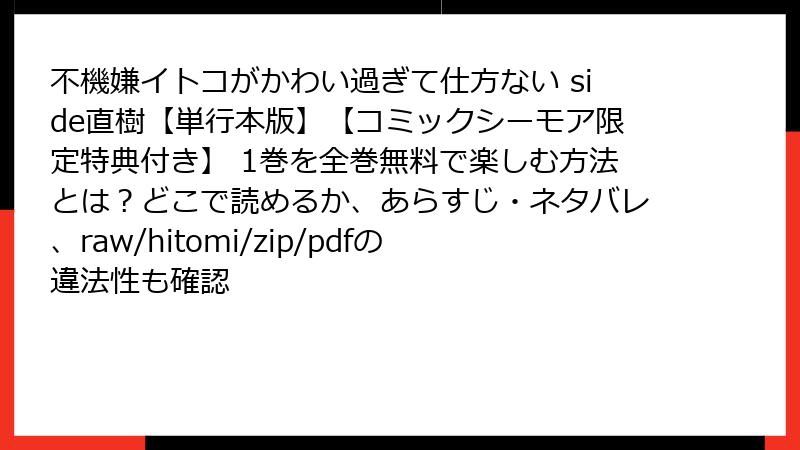 海賊版のリスクを避けるなら、コミックシーモアや他の正規プラットフォームで『不機嫌イトコがかわい過ぎて仕方ない side直樹』を購読するのが一番。以下に、正規ルートのメリットをまとめます。
