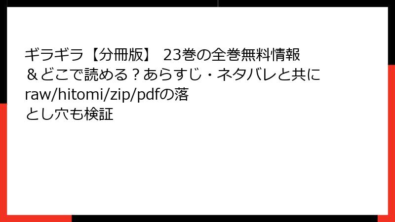 こんにちは、漫画ファンの皆さん! 滝直毅原作、土田世紀作画の『ギラギラ【分冊版】23巻』は、ホスト業界のドラマと人間模様が魅力の作品ですが、今回はこの漫画を「raw」「hitomi」「zip」「pdf」「漫画バンク」といった海賊版サイトで読むことのリスクについて、詳しく解説します。無料で読める誘惑は魅力的かもしれませんが、そこには重大な危険が潜んでいます。法的問題から個人情報の漏洩、さらにはデバイスへのダメージまで、ブログ記事形式で徹底的に掘り下げます。漫画を愛するからこそ、正しい選択をするための知識を身につけましょう!