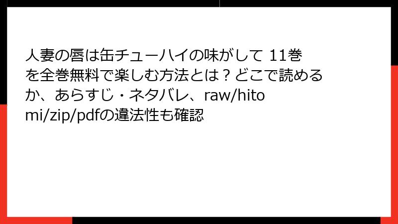 こんにちは、漫画レビューを愛するブロガーです! 今回は、チンジャオ娘原作・野上たま作画の大人気エロティックオムニバス『人妻の唇は缶チューハイの味がして』11巻のネタバレを、たっぷりとお届けします。このシリーズは「人妻×ストロング系缶チューハイ」という独特のコンセプトで、背徳感と情熱が交錯する物語が魅力。11巻は、過去の憧れと再会、そして再燃する情事が織りなす102ページの濃密な内容です。以下、2つのエピソードを詳細に掘り下げ、主要なネタバレを惜しみなく公開! 読み応え抜群で、シリーズのファンも初見の方も楽しめるように構成します。ネタバレ全開なので、未読の方はご注意を!