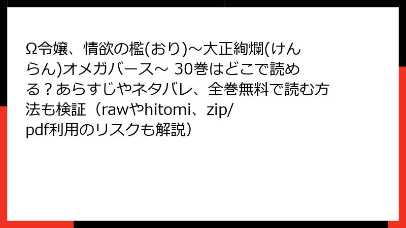 『Ω令嬢、情欲の檻~大正絢爛オメガバース~』をraw、hitomi、zip、pdf、漫画バンクなどの海賊版サイトで読むことは、法的、技術的、倫理的なリスクを伴います。著作権侵害による処罰、デバイスや個人情報の危険、クリエイターへのダメージ、そして劣悪な読書体験は、無料という誘惑に見合わない重い代償です。好きな作品を長く楽しむためにも、正規の方法で『Ω令嬢』を読み、菫野さとみの情熱を応援しましょう。30巻のクライマックスを、安心して心から堪能するために、今日から合法的な選択を!