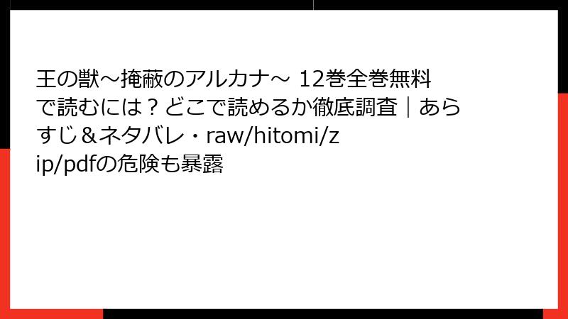 こんにちは、漫画ファン必見のブログへようこそ! 今日は、藤間麗先生の人気作『王の獣~掩蔽のアルカナ~』のような素晴らしい作品を、海賊版サイト(raw、hitomi、zip、pdf、漫画バンクなど)で読もうとするリスクについて、徹底的に掘り下げてお話しします。正規ルートで楽しむのが一番ですが、つい「無料で読みたい」と思ってしまう気持ちもわかります。でも、そんなサイトに手を出すと、法的トラブルから個人情報漏洩、さらには端末の破壊まで、取り返しのつかない被害が待っています。この記事では、具体的な事例を交えながら、なぜ絶対に避けるべきかを読み応え満点で解説。あなたの安全を守るためのガイドとしてお役立てください!