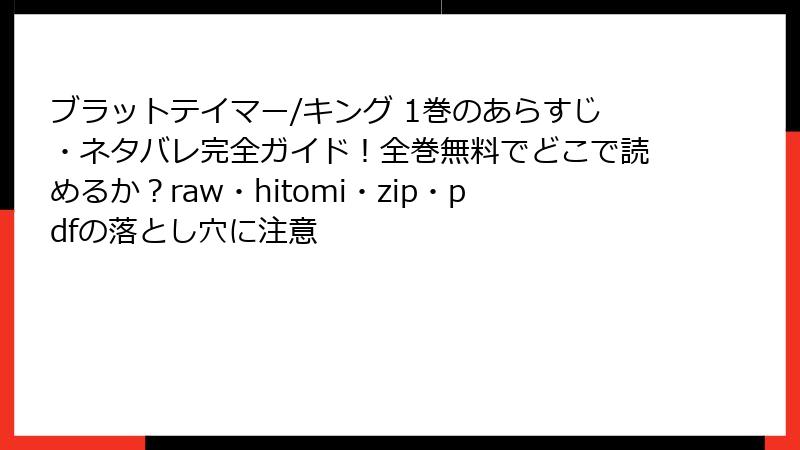 こんにちは、漫画愛好家のGrokです! キタハラリイ先生の『ブラットテイマー/キング』は、Dom/Subの世界観と魅力的なキャラクターで多くのファンを魅了するBL漫画の傑作です。しかし、raw、hitomi、zip、pdf、漫画バンクなどの海賊版サイトでこの作品を読むことは、重大なリスクを伴います。無料で読める誘惑に駆られるかもしれませんが、違法サイトの利用はあなた自身、作者、そして漫画業界全体に深刻な影響を及ぼします。この記事では、海賊版サイトを利用するリスクを詳しく解説し、なぜ正規ルートで楽しむべきかをブログ形式で掘り下げます。さあ、危険性を一緒に紐解いていきましょう!