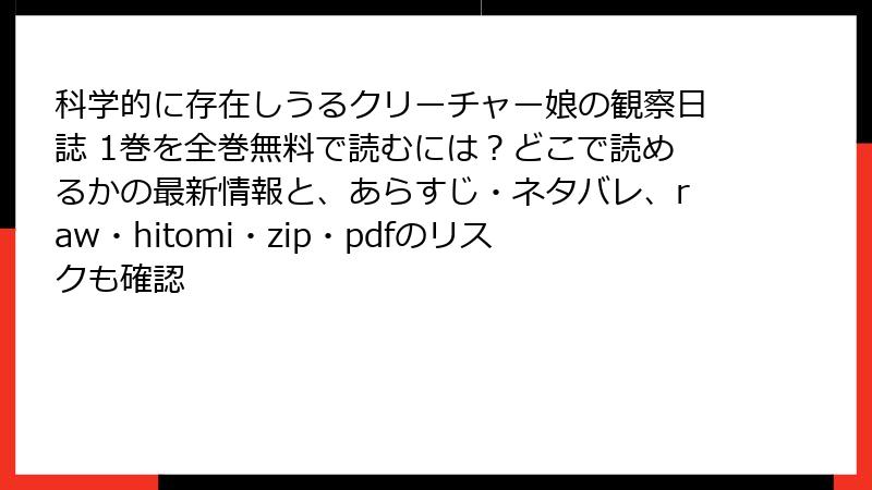 こんにちは、漫画ファンの皆さん! 『科学的に存在しうるクリーチャー娘の観察日誌』は、KAKERU先生によるユニークな異世界ファンタジー漫画で、科学的な視点と魅力的なクリーチャー娘たちが織りなす物語が人気です。しかし、この素晴らしい作品をraw、hitomi、zip、pdf、漫画バンクなどの海賊版サイトで読もうと考える方もいるかもしれません。今回は、海賊版サイトを利用することのリスクを詳しく解説します。無料で読める誘惑に負ける前に、知っておくべき危険性をブログ記事形式で掘り下げます。読み応えのある内容で、法的、技術的、倫理的な観点からしっかりお伝えします!