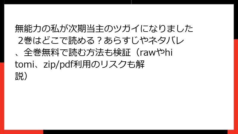 こんにちは、マンガ愛好家の皆さん! 宇野みささん原作、きざみノリさん作画の『無能力の私が次期当主のツガイになりました』は、学園ファンタジーとロマンスが融合した魅力的な作品で、2巻の展開に夢中になっている方も多いはず。そんな人気作を無料で読もうと、raw、hitomi、zip、pdf、漫画バンクなどの海賊版サイトに手を出すのは危険です! この記事では、海賊版サイトを利用することのリスクを法的な問題からセキュリティの脅威まで詳しく解説。ブログ形式で、読み応えのある内容をお届けします。なぜ正規の購入が大切なのか、しっかり理解して、安心してマンガを楽しむ方法を考えましょう!