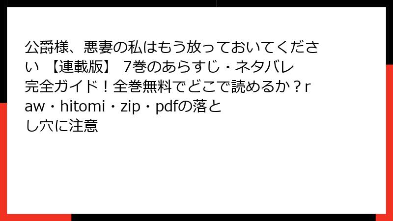 こんにちは、マンガ愛好家の皆さん! 桜乃みか先生の『公爵様、悪妻の私はもう放っておいてください 【連載版】』は、転生悪妻とドS公爵の甘々ラブコメが魅力の人気作品です。しかし、この素晴らしいマンガを、raw、hitomi、zip、pdf、漫画バンクなどの海賊版サイトで読もうと考える方もいるかもしれません。今回は、海賊版サイトを利用することのリスクを、ブログ記事形式で詳しく解説します。違法サイトの利用は、読者自身だけでなく、作者や業界全体に深刻な影響を及ぼします。単一の