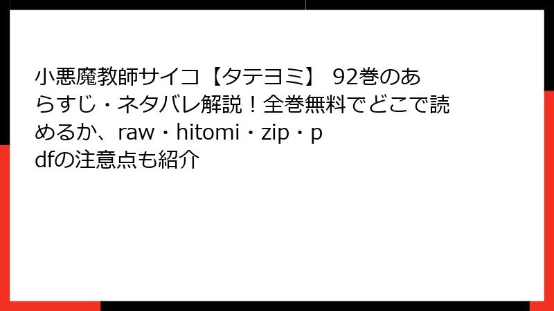 こんにちは、マンガ愛好家の皆さん! 人気のサイコスリラー『小悪魔教師サイコ【タテヨミ】』の最新巻が気になって、ついraw、hitomi、zip、pdf、漫画バンクなどの海賊版サイトに手を出したくなる気持ち、わかります。無料で全巻読めるなんて魅力的ですよね。でも、2025年現在、これらのサイトはただの「罠」です。法的罰則からウイルス感染、個人情報漏洩まで、深刻なリスクが待ち構えています。この記事では、そんな海賊版サイトの危険性を、具体例を交えながら詳しく解説。読み終わったら、正規ルートで心春の狂気を安全に味わう決意を固めてくださいね! ネタバレなしで、純粋に「読書の安全」をテーマに掘り下げます。
