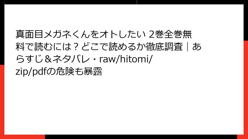 こんにちは、BL漫画ファンの皆さん! マンガマニアです。『真面目メガネくんをオトしたい』のような素敵な作品を心から楽しみたいですよね。でも、raw、hitomi、zip、pdf、漫画バンクといった海賊版サイトで漫画を読むことには、重大なリスクが潜んでいます。無料で読めるからと手を出す前に、その危険性をしっかり理解しておくことが大切! 今回は、ブログ記事形式で、海賊版サイトを利用するリスクを詳しく解説します。『真面目メガネくんをオトしたい』を正規ルートで楽しむための参考にしてください。それでは、早速本題へ!