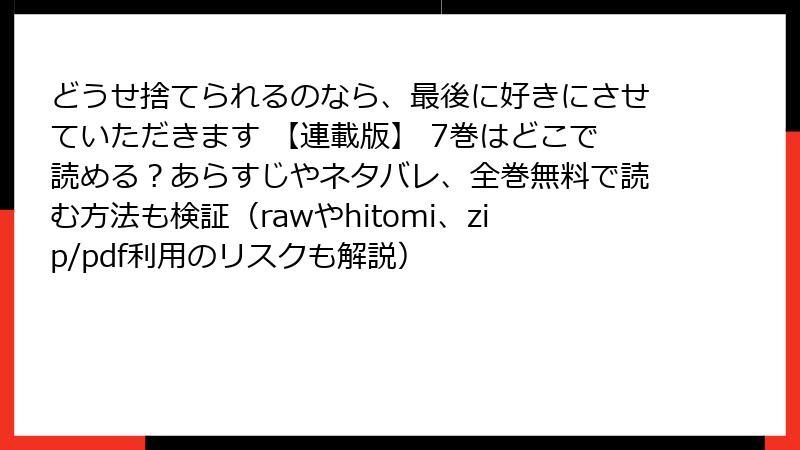 海賊版のリスクを避けるなら、正規のプラットフォームで『どうせ捨てられるのなら、最後に好きにさせていただきます』を楽しみましょう! 電子書籍や公式アプリなら、安全かつ高品質で読めます。以下に、正規ルートのメリットをまとめます。