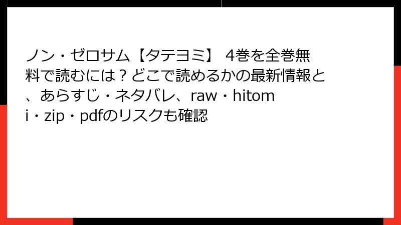 漫画好きの皆さん、無料で最新巻をサクッと読める夢のような世界に惹かれる気持ち、よくわかります。でも、『ノン・ゼロサム【タテヨミ】』のような魅力的な作品をraw、hitomi、zip、pdf、漫画バンクなどの海賊版サイトで読むのは、甘い誘惑の裏に潜むリスクが多すぎます。2025年現在、これらのサイトはドメイン変更を繰り返して生き残っていますが、利用者の被害事例が急増中。法的罰則からデバイス破壊まで、取り返しのつかないダメージを招く可能性大です。この記事では、そんなリスクを多角的に深掘り。安全な読書ライフを守るための警鐘として、ぜひ読み進めてください。