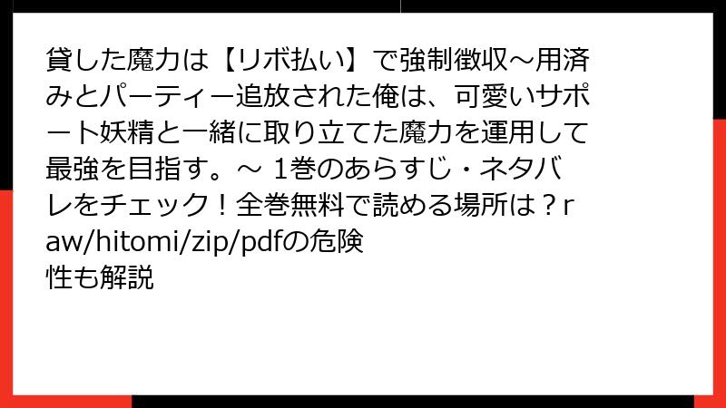 こんにちは、漫画愛好家のブロガーです! 人気の異世界ファンタジー『貸した魔力は【リボ払い】で強制徴収~用済みとパーティー追放された俺は、可愛いサポート妖精と一緒に取り立てた魔力を運用して最強を目指す。~』(以下、リボ払い魔力)の1巻が話題沸騰中ですよね。追放復讐と金融メカニクスが融合したユニークなストーリーにハマる人も多いはず。でも、raw、hitomi、zip、pdf、漫画バンクなどの海賊版サイトで無料で読もうとするのは、絶対に避けましょう! 2025年現在、これらのサイトは法的・セキュリティ・経済的な落とし穴だらけ。利用者の被害事例が急増しており、軽い気持ちでアクセスすると取り返しのつかない事態に陥る可能性大です。この記事では、そんなリスクを多角的に深掘り。ネタバレなしで正規ルートのすすめも織り交ぜつつ、読み応えある解説をお届けします。海賊版は短期的な快楽の代償がデカすぎるんですよ…。