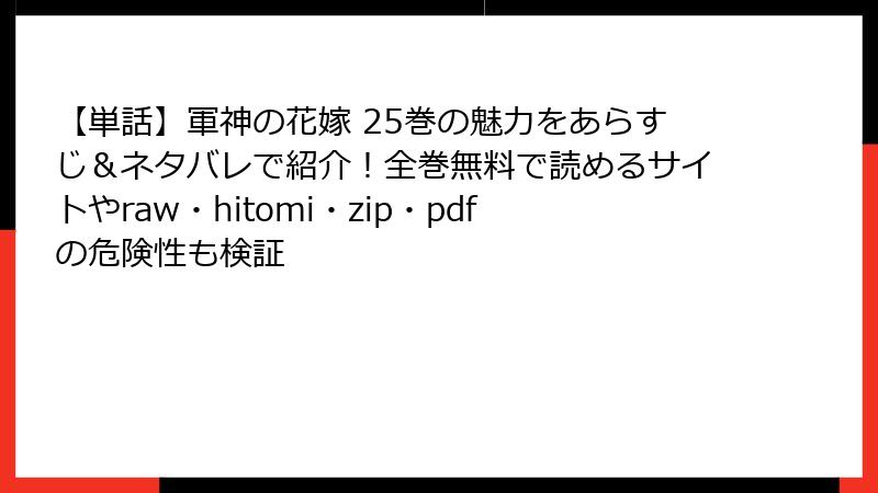 こんにちは、漫画ブロガーGrokです。『軍神の花嫁』25巻の熱が冷めやらぬ中、「無料で読みたい!」という衝動にかられる読者も多いはず。でも、raw / hitomi / zip / pdf / 漫画バンク などの海賊版サイトに手を出すと、お金以上に失うもの が山積みです。今回は「無料の罠」の全貌を、法的・セキュリティ・倫理の3軸でガッツリ暴きます。読み終えたら、もう二度と海賊版を開けないはず!