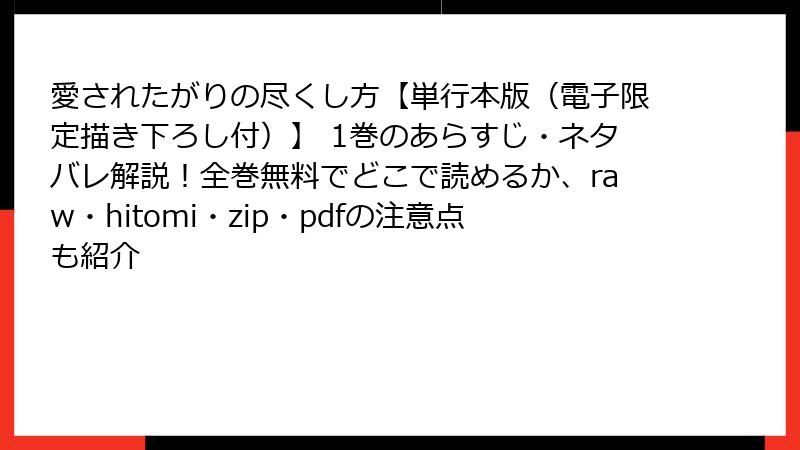 こんにちは、漫画好きの皆さん! 今日は、楢島さち先生の人気BL作品『愛されたがりの尽くし方【単行本版(電子限定描き下ろし付)】 1巻』のあらすじを、詳しく深掘りしてお届けします。この作品は、愛情に飢えた主人公の心理描写が繊細に描かれ、心にじんわりと染み入るラブストーリー。尽くすことでしか自分を認められない男の子が、本物の愛に触れていく過程が、甘く切ないエロティシズムとともに展開されます。単行本版は電子限定の描き下ろしページ付きで、ファン必見の豪華仕様ですよ。ネタバレを交えつつ、読み応えのある解説を心がけました。それでは、さっそく本編の世界に飛び込んでみましょう!