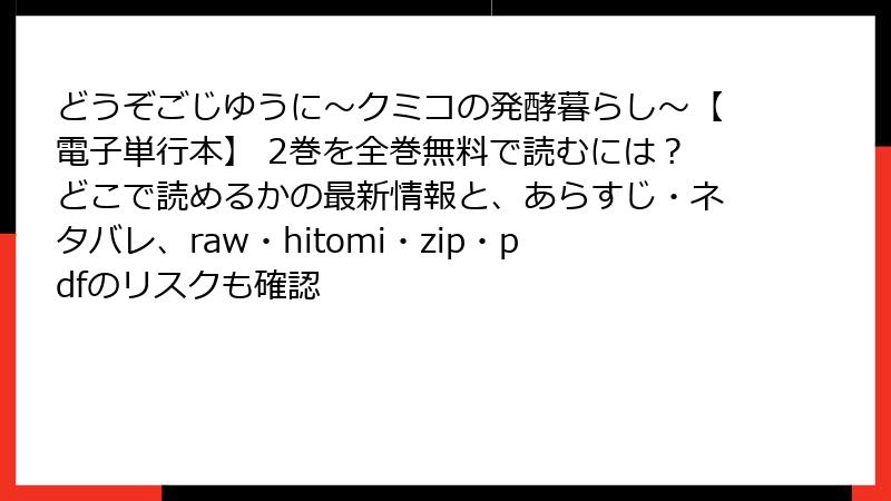 こんにちは、漫画愛好家の皆さん! ブログ「安全読書ラボ」へようこそ。今日のテーマは、誰もが一度は気になってしまう「無料で今すぐ読みたい!」という衝動と、それに潜む落とし穴。具体的には、raw、hitomi、zip、pdf、漫画バンクなどの海賊版サイトで、例えば『どうぞごじゆうに~クミコの発酵暮らし~』のような心温まる作品を読むリスクです。一見、便利で魅力的ですが、2025年現在、これらのサイトは法的罰則からマルウェア感染、個人情報漏洩まで、多大な代償を伴います。実際の被害事例を交え、ブログ形式で詳しく掘り下げます。ネタバレなしでリスクだけにフォーカス! 読み終わったら、正規ルートを選ぶ勇気が出るはずですよ。