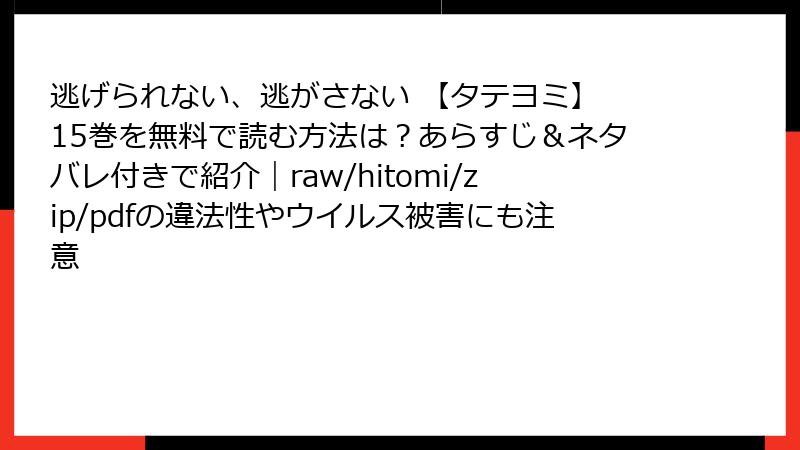 こんにちは、漫画ファン必見の安全読書ブロガーです! 人気のタテヨミ作品『逃げられない、逃がさない』のような、心揺さぶられるストーリーに没入したいですよね。でも、最新巻を「無料で今すぐ読みたい!」という衝動で、raw、hitomi、zip、pdf、漫画バンクなどの海賊版サイトに手を出していませんか? 2025年現在、これらのサイトは一見の無料パラダイスに見えますが、法的罰則からウイルス感染、個人情報漏洩まで、想像を絶するリスクが潜んでいます。実際の被害事例が急増中で、PC壊滅や逮捕の恐怖が現実味を帯びています。本記事では、こうした海賊版サイトの正体から具体的なリスクを多角的に掘り下げ、なぜ正規ルートを選ぶべきかをブログ形式で詳しく解説。ネタバレなしでリスクだけにフォーカスし、読み応え満点でお届けします。結論から言うと、利用は絶対NG! リスクを知って、安全に漫画ライフを楽しむための知識を身につけましょう。
