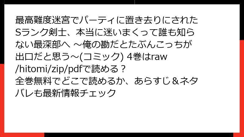 こんにちは、マンガファン歴20年の管理人です。今日のテーマは、誰もが一度は検索してしまう「raw」「hitomi」「zip」「pdf」「漫画バンク」などの海賊版サイトで、『最高難度迷宮でパーティに置き去りにされたSランク剣士、本当に迷いまくって誰も知らない最深部へ ~俺の勘だとたぶんこっちが出口だと思う~(コミック)』4巻を読むことの本当のリスク。ジルの方向音痴に爆笑しながら読みたい気持ちは痛いほど分かりますが、無料の裏には想像以上の罠が潜んでいます。法的・セキュリティ・倫理の3軸から徹底解剖し、あなたのデバイスと財布、そして好きな作品を守るための情報をまとめました。ネタバレなしで、読み応え満点でお届けします!