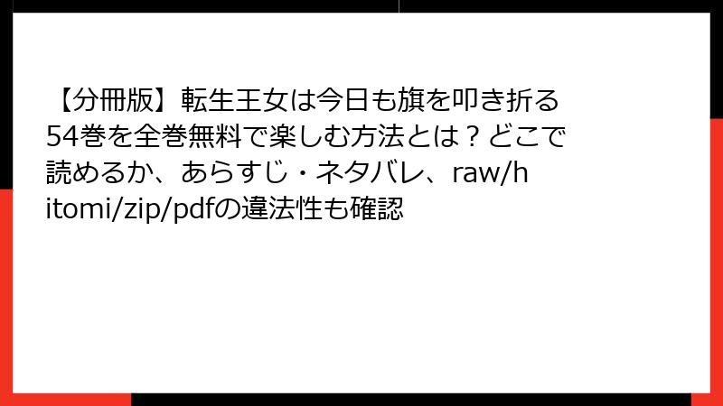 こんにちは、漫画愛好家のための安全読書ブロガー・みかです! 人気の転生ファンタジー漫画『【分冊版】転生王女は今日も旗を叩き折る』のような作品にハマると、つい「最新話が今すぐ無料で読みたい!」という衝動に駆られますよね。でも、raw、hitomi、zip、pdf、漫画バンクなどの海賊版サイトに手を出していませんか? 2025年現在、これらのサイトは一見の無料パラダイスに見えますが、法的罰則からウイルス感染、個人情報漏洩まで、想像を絶するリスクが潜んでいます。実際の被害事例が急増中で、軽い気持ちでアクセスすると取り返しのつかない事態に陥る可能性大です。この記事では、そんな海賊版サイトのリスクを多角的に深掘り。ブログ形式で読みやすくまとめました。結論から言うと、絶対に避け、正規ルートで楽しむのが賢明。作者の努力を尊重し、安全にハマりましょう!