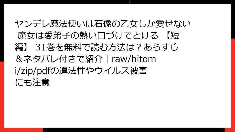 こんにちは、漫画好きの皆さん! 人気のファンタジー短編シリーズ「ヤンデレ魔法使いは石像の乙女しか愛せない 魔女は愛弟子の熱い口づけでとける 【短編】」の31巻が話題沸騰中ですが、無料で読みたい一心でraw、hitomi、zip、pdf、漫画バンクなどの海賊版サイトに手を出していませんか? 確かに一見お得に見えますが、実際には深刻なリスクが潜んでいます。この記事では、そんな海賊版サイトの具体的な危険性を、法的・セキュリティ・経済的な側面から詳しく掘り下げます。2025年現在、出版社の摘発強化で閉鎖ラッシュが続いていますが、模倣サイトも横行中。読了後には、正しい楽しみ方を再確認できるはずです!