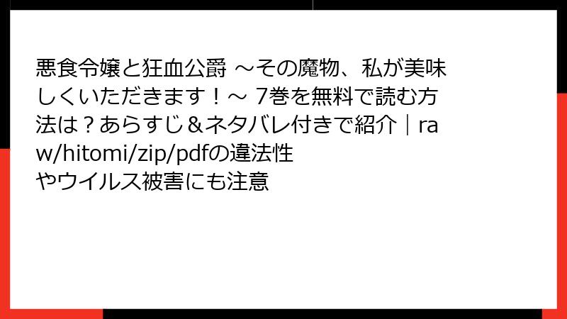 こんにちは、ファンタジー漫画好きのブロガーです! 今回取り上げるのは、pixivで大ヒットした異世界グルメファンタジー『悪食令嬢と狂血公爵 ~その魔物、私が美味しくいただきます!~』の7巻。メルフィエラの「悪食」趣味が炸裂しつつ、ガルブレイスとの甘い関係が深まるこの巻は、アクション満載で読み応え抜群! ネタバレ満載の詳細あらすじをお届けしますので、未読の方はご注意を。シリーズの魅力である魔物料理の描写がさらに進化していて、腹ペコになりながら胸キュン必至です。それでは、各章ごとに掘り下げていきましょう。