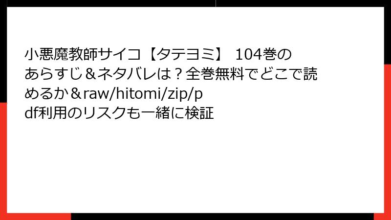 こんにちは、漫画を心から愛する皆さん! 『小悪魔教師サイコ【タテヨミ】』の最新104巻が気になって仕方ない…でも、無料で読める「raw」「hitomi」「zip」「pdf」「漫画バンク」などの海賊版サイトに手が伸びそうになっている方、ちょっと待ってください!