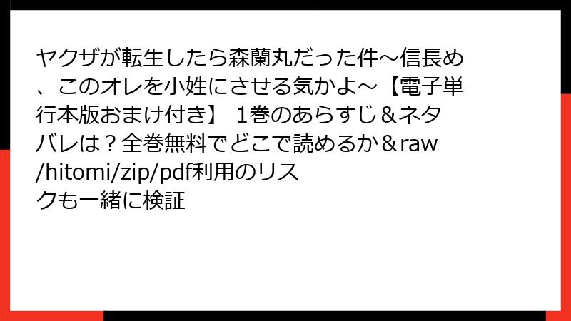 こんにちは、漫画愛好家の皆さん! 『ヤクザが転生したら森蘭丸だった件~信長め、このオレを小姓にさせる気かよ~』の熱いストーリーにハマってしまったあなた。1巻の衝撃展開から「今すぐ続きが読みたい!」と検索したら、raw、hitomi、zip、pdf、漫画バンク…そんな怪しげなキーワードがズラリ。でも、ちょっと待ってください! 無料の誘惑に飛びつく前に、このブログで海賊版サイトのリアルなリスクをガッツリ解説します。作者・出版社へのダメージから、あなたのスマホがヤバいことになるまで、全部包み隠さず暴露。読み終わる頃には「正規版で買うしかない!」と心に誓うはずです。