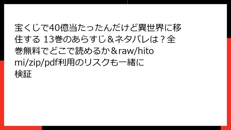 こんにちは、マンガ好きの皆さん! 人気急上昇中の『宝くじで40億当たったんだけど異世界に移住する』(通称:宝くじ異世界)は、コミカライズ18巻まで進行中で、電子書籍・紙書籍ともに好評発売中。でも、ネット上には「raw」「hitomi」「zip」「pdf」「漫画バンク」といった海賊版サイトが横行し、無料で全巻読めてしまう…そんな誘惑に負けそうになったことはありませんか? 今回は、そんな海賊版利用の実害を、法的・経済的・技術的・倫理的観点から徹底的に掘り下げます。結論から言うと「絶対にやめましょう」。読み応え重視で、リスクをリスト・テーブルで整理してお届けします。