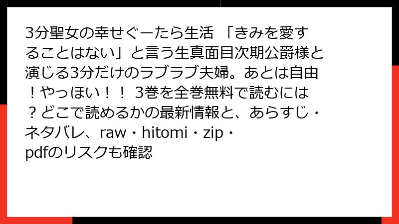 こんにちは、漫画ラバー管理人です! 今日のテーマは、超人気の『3分聖女の幸せぐーたら生活 「きみを愛することはない」と言う生真面目次期公爵様と演じる3分だけのラブラブ夫婦。あとは自由!やっほい!!』(以下、3分聖女)を、raw・hitomi・zip・pdf・漫画バンクなどの海賊版サイトで読むことのリアルなリスク。ノイシャの「やっほい!」な世界を無料で楽しみたい気持ちはわかるけど、その代償は想像以上に大きいんです。法律・セキュリティ・倫理・健康の4軸から徹底解説。読み終わる頃には、正規版を選ぶ理由が100個増えますよ!