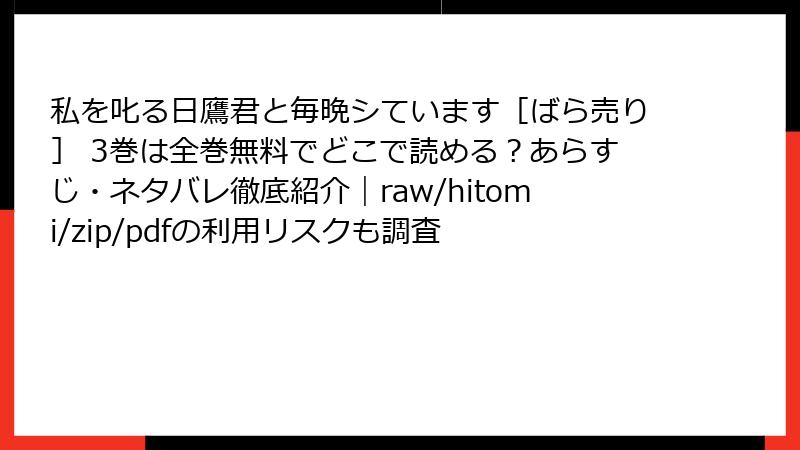 『私を叱る日鷹君と毎晩シています 3巻』をraw/hitomi/zip/pdf/漫画バンクで読むのは、法的・セキュリティ・倫理の三重苦。特に2025年は警察の摘発強化+マルウェア進化で、「バレない」は通用しません。日鷹君の「叱る」愛情のように、「正規購入=自分を大切にする選択」です。1,120円で安全+続き保証+作者応援。賢いファンなら、正規ルート一択! 次回は4巻の正規レビューでお会いしましょう♪