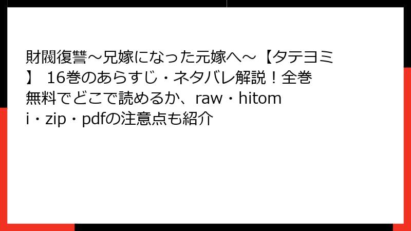 こんにちは、漫画好きのブロガーです! 今日も熱いおすすめをお届けします。今回は、復讐劇の傑作として話題沸騰中の『財閥復讐~兄嫁になった元嫁へ~』の16巻について、詳しくあらすじを掘り下げてみます。この作品は、財閥の闇と人間の裏切りが絡み合うスリリングなストーリーで、読むたびに心臓がバクバクしますよね。原作の緊張感がビシビシ伝わってくる中、16巻では主人公の由貴也の計画がさらに深みを増し、元妻・絵里香の反撃が炸裂! ネタバレ満載でお届けするので、まだ読んでいない方はご注意を。では、さっそく全体像から紐解いていきましょう。