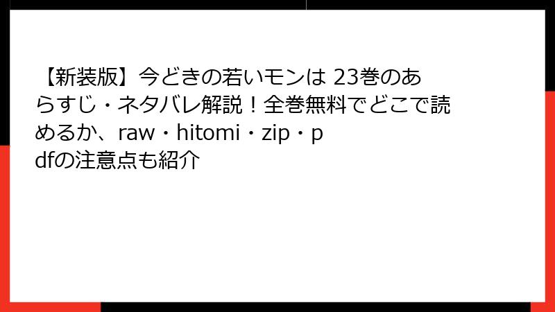 こんにちは、漫画好きのブロガーです! 今日は、吉谷光平先生の人気作『【新装版】今どきの若いモンは』を、raw、hitomi、zip、pdf、漫画バンクなどの海賊版サイトで読むことの「本当のリスク」について、ガチで深掘りします。2025年11月現在、26巻まで出ているこの作品、めちゃくちゃ面白いからこそ、正規ルートで楽しんでほしいんです。海賊版は一見「無料で便利」ですが、裏側には法的な罠、セキュリティの地雷、倫理的な後悔が山積み。23巻のネタバレレビューを読んでくれた皆さんなら、作品愛がわかるはず。この記事でリスクをしっかり把握して、賢い選択をしましょう! 読み応え重視で、具体例たっぷりでお届けします。