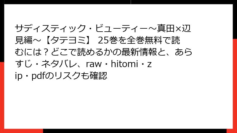 『サディスティック・ビューティー~真田×辺見編~』は、配信サービス豊富でどこからでもアクセスしやすい名作。コスパならめちゃコミック、クーポン重視ならBookLiveやまんが王国が鉄板。未配信のピッコマ/LINEマンガ勢はebookjapanでカバー! 試し読みから始め、真田の「そばで一生不幸になれ」に震えてください。あなたのおすすめストアは? コメントでシェアを♪ 次回は本編の配信ガイドをお届けします。お楽しみに!