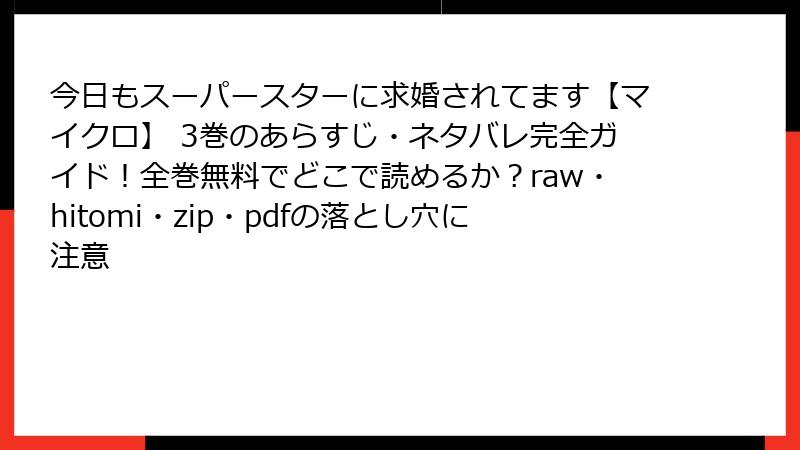 こんにちは、マンガ好きのブロガーです! 今日は、七海月先生の人気マイクロ恋愛漫画『今日もスーパースターに求婚されてます【マイクロ】』の3巻について、詳しくあらすじを掘り下げてお届けします。この作品は、国民的スーパースターと普通のOLのギャップ萌えがたまらない、胸キュン満載のラブストーリー。毎日のようにプロポーズされるのに、素直になれないヒロインの葛藤が、読者の心をくすぐります。3巻では、そんな関係がさらに深みを増し、嫉妬や誤解が絡み合う展開がスリリング! ネタバレ注意で、読み応えのある詳細をお伝えします。まだ読んでいない方は、ここでストップを♪