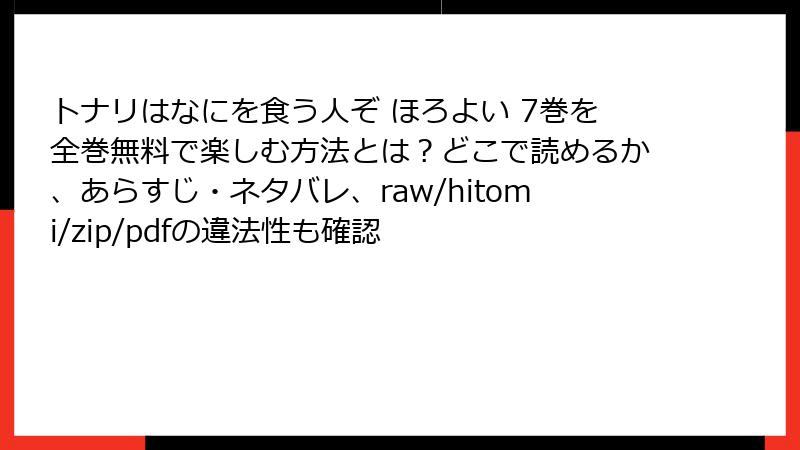 『トナリはなにを食う人ぞ ほろよい』は、ただ甘いだけじゃない。料理を通じて描かれる日常の幸せが、読者の心をほろ酔い状態に導きます。あなたもレビュー読んで気になったら、ぜひ正規ルートでチェックを! 次巻の予約が殺到中ですよ~。