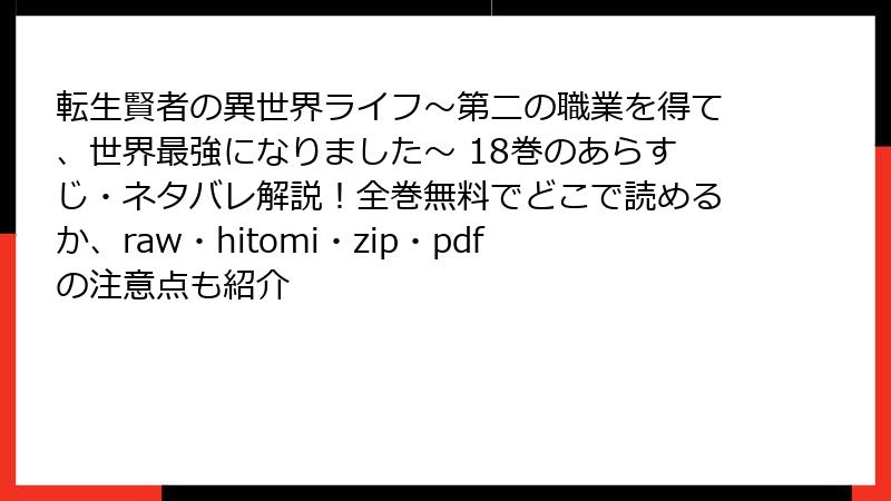 待望の『転生賢者の異世界ライフ ~第二の職業を得て、世界最強になりました~』コミック18巻のネタバレを、徹底的に掘り下げます! 前巻までのユージの無双っぷりがさらにエスカレートしつつ、陰謀の影が濃くなる本巻。組織の非道な実験や、仲間たちの絆が試される展開は、シリーズ屈指の緊張感。ネタバレ全開なので、未読の方は今すぐブックマーク! 今回は、シーンごとの詳細解説から隠し要素まで、ファン目線でガッツリお届け。学校通いの伏線もチラリと見え隠れする中盤以降の深みも見逃せません。