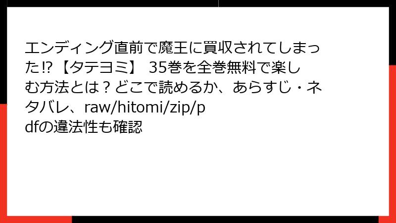 こんにちは、タテヨミ漫画ハンターのブロガーです! 伊勢ともか先生の異世界買収ファンタジー「エンディング直前で魔王に買収されてしまった⁉【タテヨミ】」は、35巻で買収オファーの衝撃が炸裂する神回として大注目。タテヨミ形式の縦スクロールがスマホ読みに最適で、電子書籍でサクサク進むのが最高ですよね。でも、どこで読めるか迷う人も多いはず。今回は、指定の人気サービス(コミックシーモア、ブックライブ、めちゃコミック、ピッコマ、LINEマンガ、まんが王国、ebookjapan、Renta!)を中心に、2025年11月21日現在の配信状況を徹底調査! 35巻の入手しやすさやお得ポイントを、テーブルとリストで詳しく解説します。公式配信を応援して、作者先生を支えましょう♪