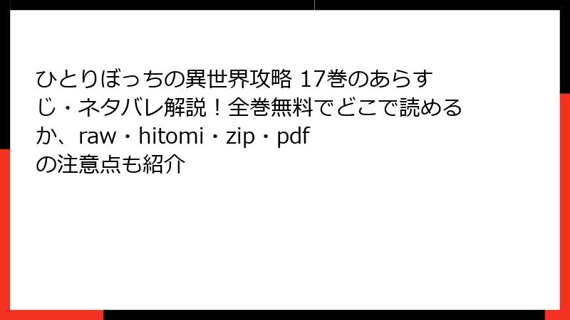 17巻のレビュー・口コミを総括すると、好評の嵐で「ぼっちのHARDモードがさらに進化」との声が大半。不満は設定の陳腐化ですが、それすら「逆手に取った面白さ」とポジ転換するファンも。アニメ化の余波で新規層が増え、評判は右肩上がりです。管理人としては、舞踏会のドタバタに大爆笑&感動の連続。皆さんはどう思いましたか? コメントで感想シェアを! 次は18巻の迷宮深層編を予想しつつ、待機モードです。合法購入で作者応援を忘れずに♪