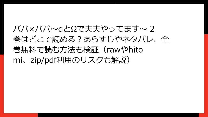 海賊版サイトで『パパ×パパ ~αとΩで夫夫やってます~』を読むリスクは、法的・セキュリティ・プライバシー・品質・経済の多角面に及びます。これらを総合すると、短期的な利便性が長期的なトラブルを招くだけです。公式の電子書籍サービスや書店で購入し、安全に作品を堪能しましょう。あなたの選択が、作者の未来を支えます。海賊版の誘惑に負けない賢い読者になりましょう!