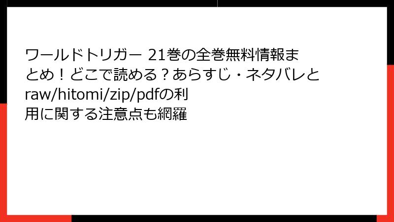人気マンガ「ワールドトリガー」の21巻を、raw、hitomi、zip、pdf、漫画バンクなどの海賊版サイトで読むのは、一見手軽に思えますが、多大なリスクを伴います。これらのサイトは著作権を無視した違法アップロードが多く、利用者が知らずにトラブルに巻き込まれる可能性が高いです。以下では、法的、セキュリティ、経済的、品質面などの観点から詳しく解説します。海賊版の利用は避け、正規ルートを選ぶことを強くおすすめします。