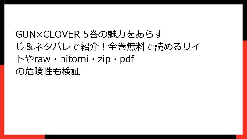 皆さん、こんにちは! 人気漫画『GUN×CLOVER』を無料で楽しみたいという誘惑はわかりますが、海賊版サイト(raw、hitomi、zip、pdf、漫画バンクなど)を利用するのは、さまざまな危険を伴います。この記事では、そんな海賊版サイトで漫画を読むリスクを詳しく掘り下げます。法的問題からセキュリティの脅威、さらには倫理的な側面まで、読み応えのある内容でお届け。知らずにアクセスすると、後悔するかも…? さっそく見ていきましょう。