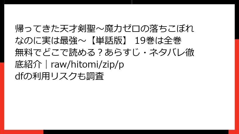 人気ファンタジー漫画『帰ってきた天才剣聖~魔力ゼロの落ちこぼれなのに実は最強~』を楽しむ方法として、海賊版サイトの利用を検討する人もいるかもしれません。しかし、これらのサイト(raw、hitomi、zip、pdf、漫画バンクなど)は違法アップロードされたコンテンツを提供しており、利用には深刻なリスクが伴います。この記事では、法的・セキュリティ面を中心に、海賊版サイトの危険性を詳しく解説。漫画ファンとして、正規ルートを選ぶ重要性を再確認しましょう。海賊版は一時的な無料アクセスに見えますが、長期的に見て損失が大きいのです。