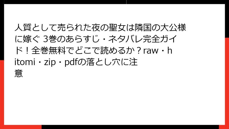 こんにちは、漫画ファン歴20年の私です! 人気作『人質として売られた夜の聖女は隣国の大公様に嫁ぐ』を愛する皆さん、無料で読みたい気持ちはわかりますが、海賊版サイト(raw、hitomi、zip、pdf、漫画バンクなど)を利用するのは絶対にNG! 今回は、そんな違法サイトで読むリスクを詳しく掘り下げます。法的トラブルからセキュリティの脅威まで、リアルな危険を基に警告します。合法的な方法で楽しむのが一番ですよ。読み応え満載で、箇条書きやテーブルを活用してわかりやすくまとめました。あなたのデバイスと心を守るために、ぜひ最後までお読みください。