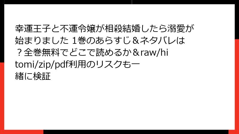 人気のファンタジーロマンスコミック『幸運王子と不運令嬢が相殺結婚したら溺愛が始まりました』1巻。甘い溺愛ストーリーにハマる読者が増えていますが、raw、hitomi、zip、pdf、漫画バンクなどの海賊版サイトで無料で読もうとする人も少なくありません。しかし、そんな行為には深刻なリスクが伴います。この記事では、海賊版サイト利用の危険性を多角的に解説。法的問題からセキュリティ面まで、詳しく掘り下げます。絶対に手を出さないよう、しっかり理解してください!