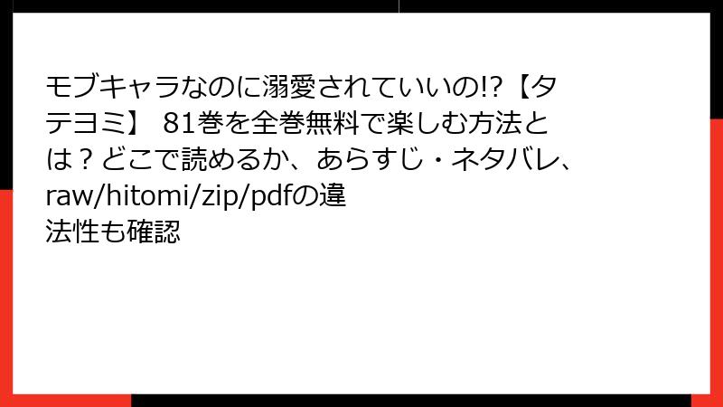 人気の異世界転生ラブファンタジー『モブキャラなのに溺愛されていいの!?【タテヨミ】』を、raw/hitomi/zip/pdf/漫画バンクなどの海賊版サイトで無料で読もうと考えている人もいるかもしれません。しかし、そんな行為には深刻なリスクが伴います。この記事では、法的問題からセキュリティの脅威、倫理的側面まで、詳しく掘り下げて解説します。海賊版サイトの利用は一見お得に見えますが、後悔する前に知っておくべき事実をまとめました。読み進めながら、自分ごととして考えてみてください。
