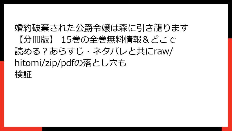 raw、hitomi、zip、pdf、漫画バンクなどの海賊版サイトで『婚約破棄された公爵令嬢は森に引き籠ります』を読むのは、法的・セキュリティ・経済的・品質的な多大なリスクを伴います。一時の無料欲に負けず、作者を応援する形で楽しむのが賢明です。トラブルに巻き込まれる前に、考え直してみてください。安全第一で、素晴らしい漫画ライフを!