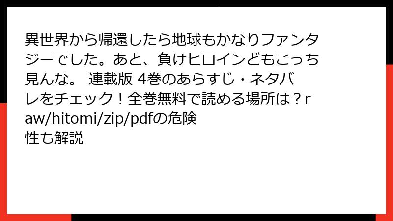 こんにちは、ファンタジー漫画好きのブロガーです! 今日の記事では、人気コミカライズ作品『異世界から帰還したら地球もかなりファンタジーでした。あと、負けヒロインどもこっち見んな。』の連載版4巻にスポットを当てて、詳細なあらすじをネタバレ満載でお届けします。この作品は、異世界で過酷な冒険を終えた主人公が、帰還したはずの地球でさらにぶっ飛んだファンタジー要素に巻き込まれる、逆転の発想が魅力の現代ファンタジー。タイトル通り、主人公の「もう巻き込まれたくない!」という叫びが笑えるポイントです。