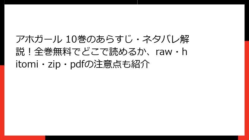 こんにちは、漫画ファン向けのブログへようこそ! 今日は、人気ギャグ漫画『アホガール』10巻を、raw、hitomi、zip、pdf、漫画バンクなどの海賊版サイトで読むことのリスクについて、詳しく掘り下げます。これらのサイトは無料でアクセスしやすく魅力的ですが、実は深刻な問題を抱えています。法的トラブルからセキュリティ脅威まで、さまざまな角度から解説します。未読の方は正規ルートをおすすめしますが、まずはリスクを知って賢く楽しむための知識を身につけましょう。